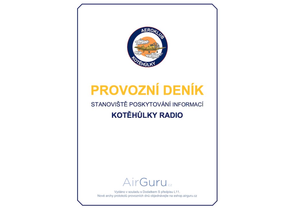 Na titulní stranu šanonu umístíme logo Vašeho aeroklubu, letiště nebo společnosti. Celý provozní deník je přizpůsoben přímo Vašemu letišti, což se týká například volacího znaku, provozního kmitočtu a čísla RWY na každé straně protokolu.
