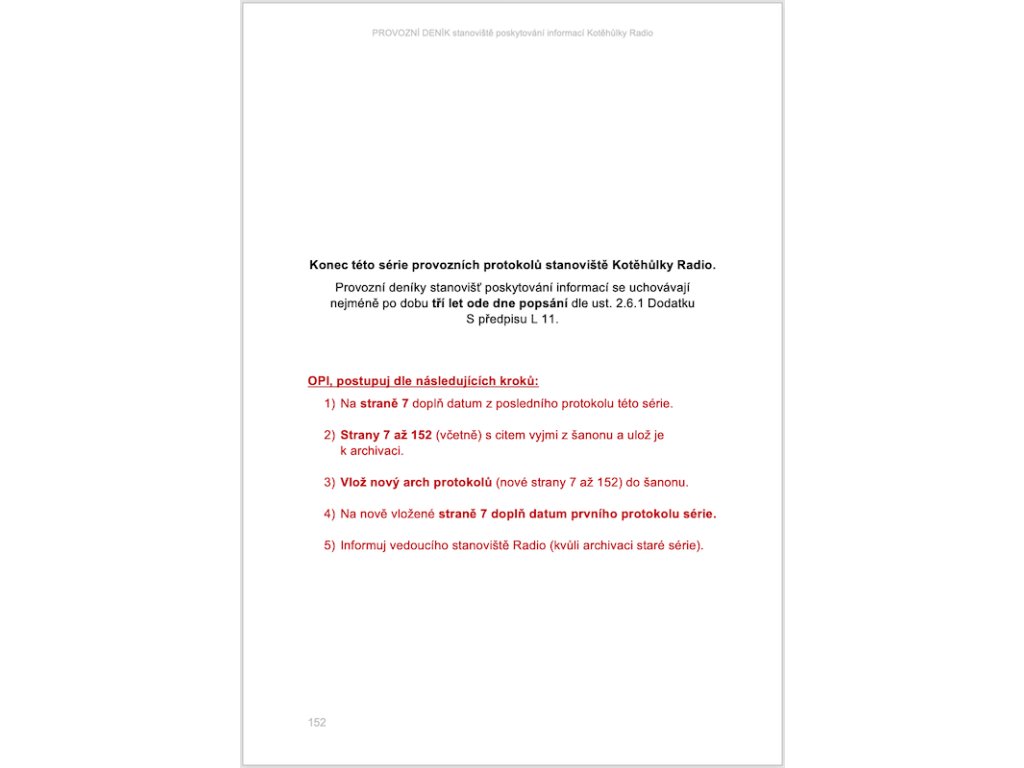 - vložený protokolový arch pro 72 provozních dnů (vyjímatelné pro archivaci v souladu s předpisem L11).